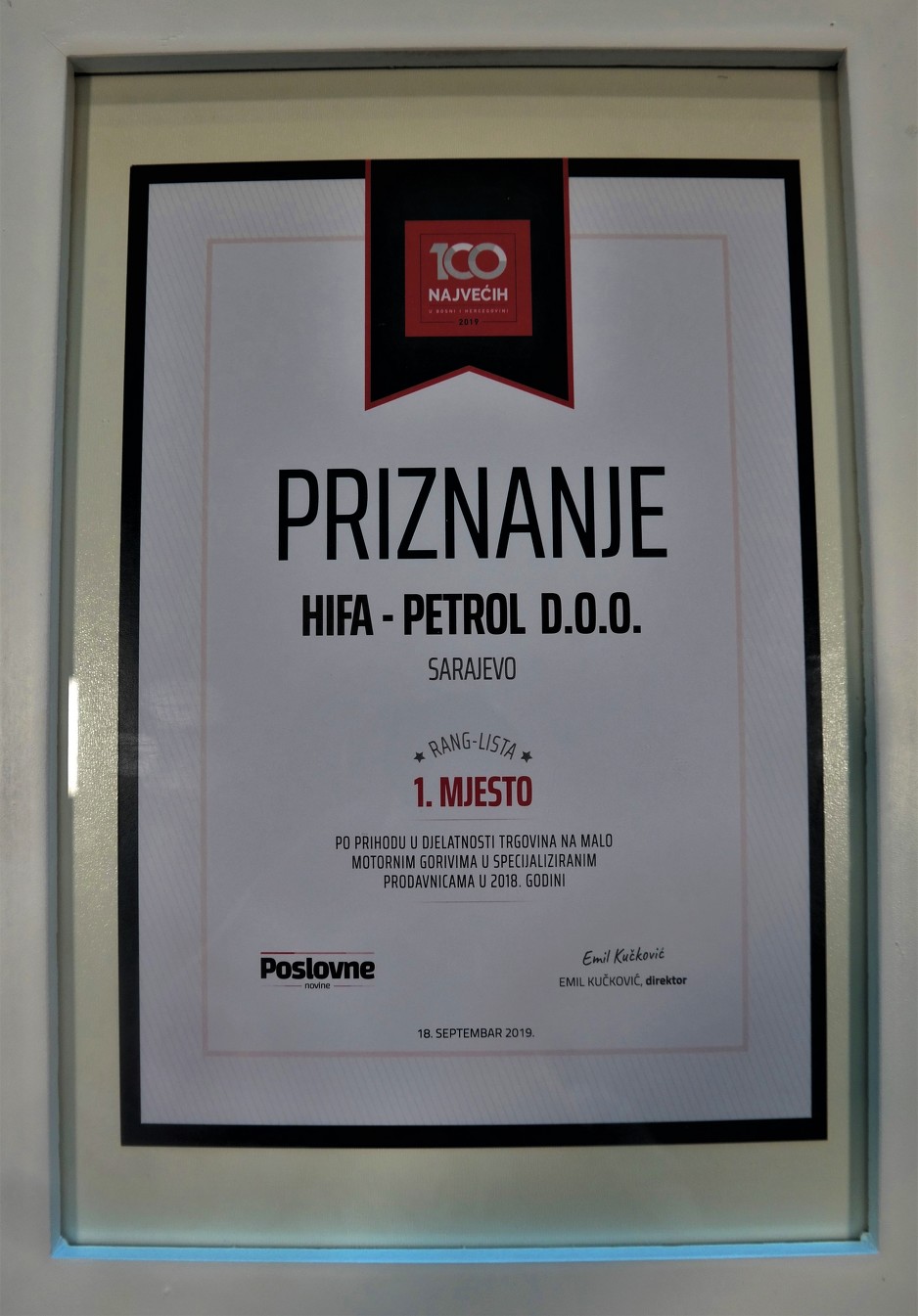 Nagrada je uručena vlasniku i generalnom direktoru kompanije, gospodinu Hajrudinu Ahmetliću. Prema riječima gospodina Ahmetlića, učešće Hifa Petrola na tržištu maloprodaje i veleprodaje nafte i naftnih derivata u BiH bilježi konstantan rast, a u prvoj polovini 2019. godine bilježe najbolje poslovne rezultate od postanka kompanije.