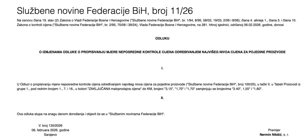 Podsjetimo, prije toga odnosno krajem 2025. Vlada FBiH je donijela odluku kojom je do 1. marta ove godine produžava mjera zaključanih cijena osnovnih prehrambenih i higijenskih namirnica.